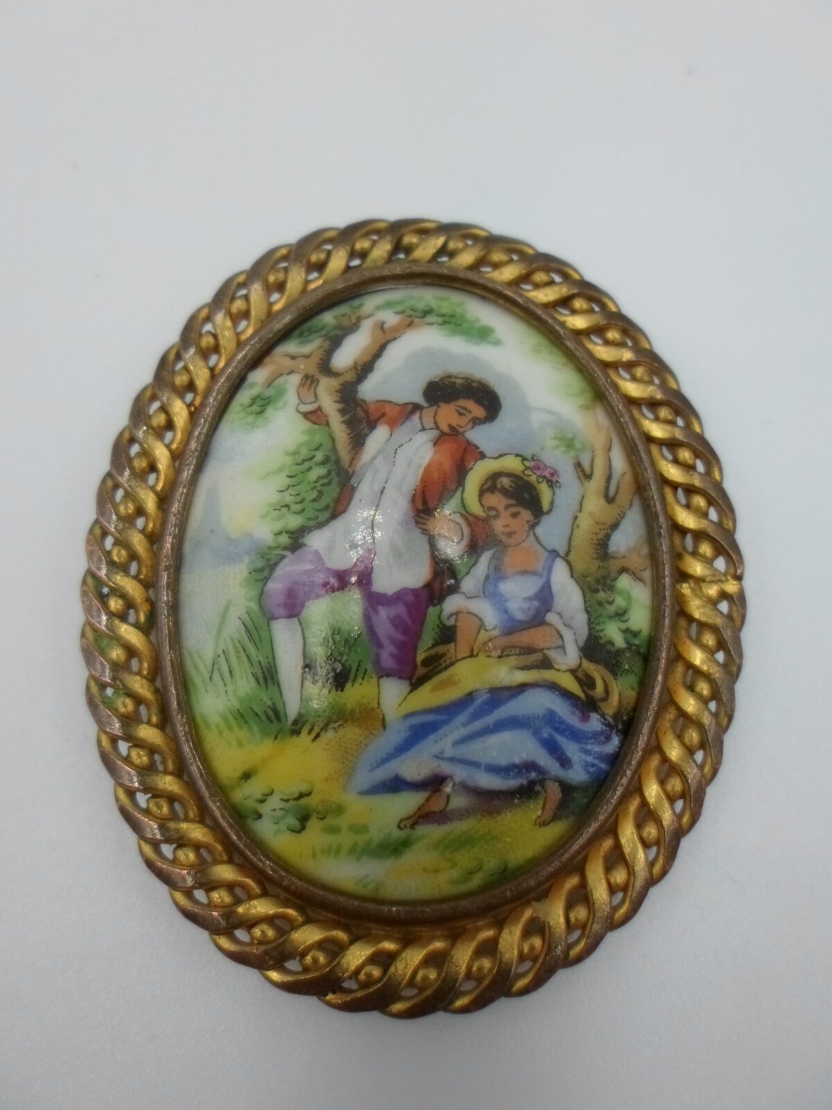 - Ręcznie malowany motyw – Broszka przedstawia subtelną scenę inspirowaną klasycznym malarstwem francuskim, którą wykonano ręcznie na wysokiej jakości porcelanie. Każdy detal tej sceny został precyzyjnie odtworzony, tworząc obraz o niezwykłej głębi i delikatności.