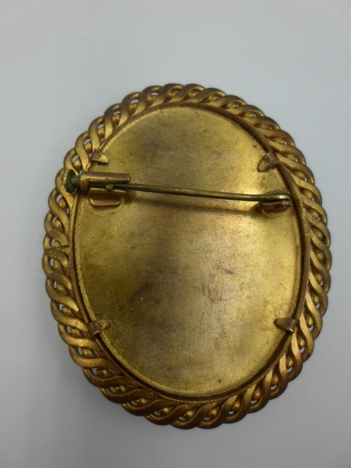 - Złocone obramowanie – Broszka oprawiona jest w subtelne, złocone obramowanie z mosiądzu, które podkreśla jej wyrafinowany styl i dodaje całości luksusowego charakteru. Delikatne złocenia harmonijnie komponują się z malunkiem, tworząc zbalansowaną, klasyczną całość.