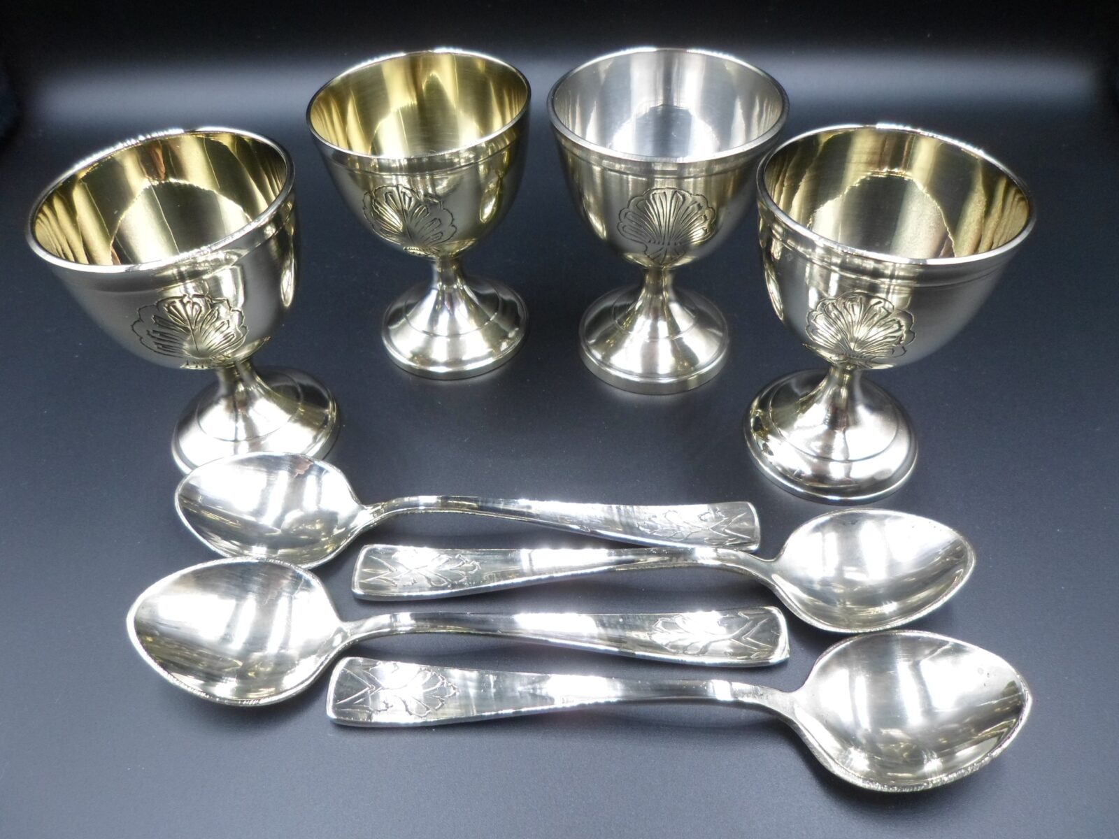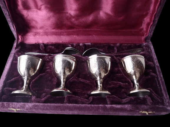 z przyjemnością przedstawiamy Państwu unikalną oferta wyjątkowego zestawu 4 kieliszków z łyżeczkami do jajek, sygnowany E.P.N.S.