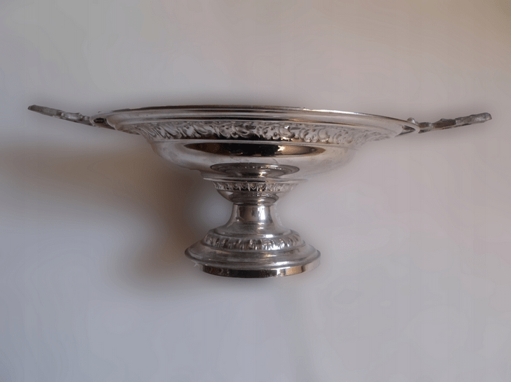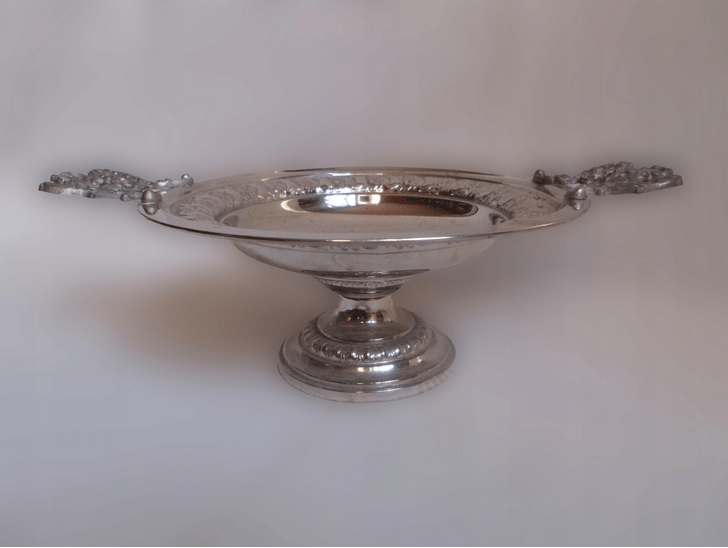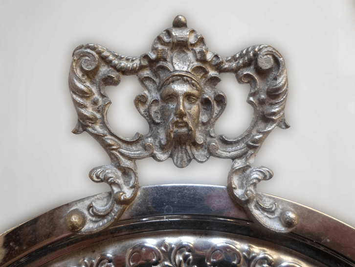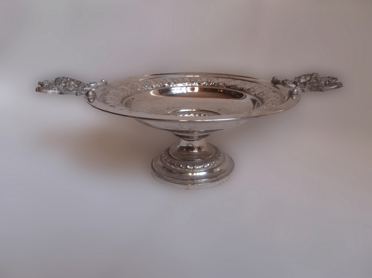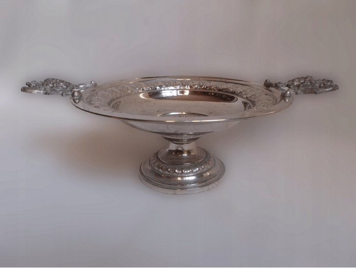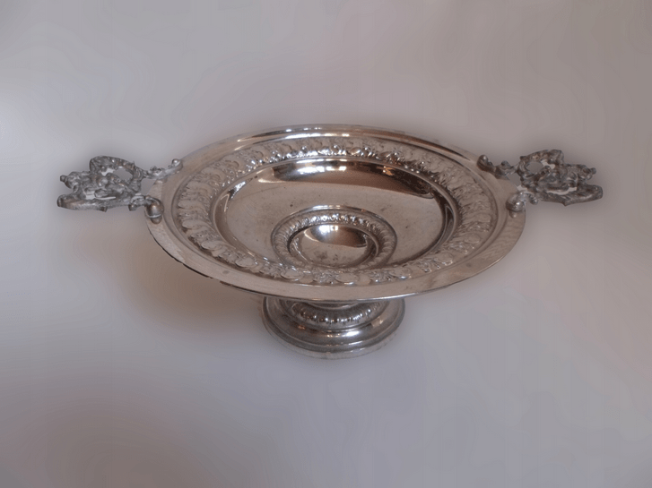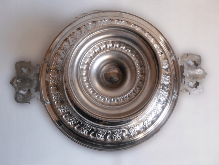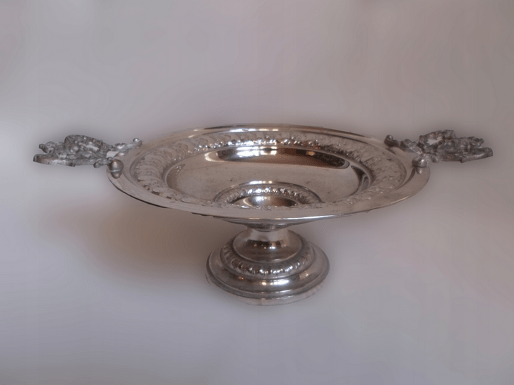 Patera z ornamentem i bogato zdobionymi uchwytami jest prawdziwym arcydziełem sztuki.