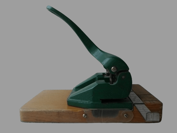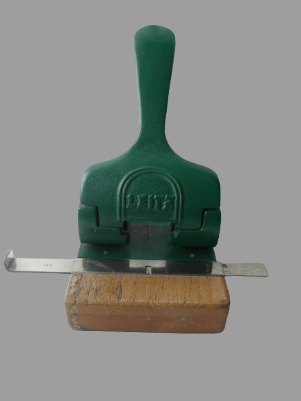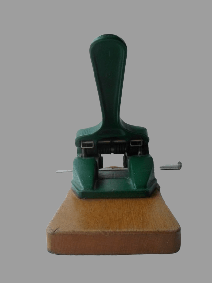 - dziurkacz używany, nosi normalne ślady użytkowania w postaci rysek i zadrapań części drewnianej, w podstawie drewnianej brak kawałka plastiku – foto