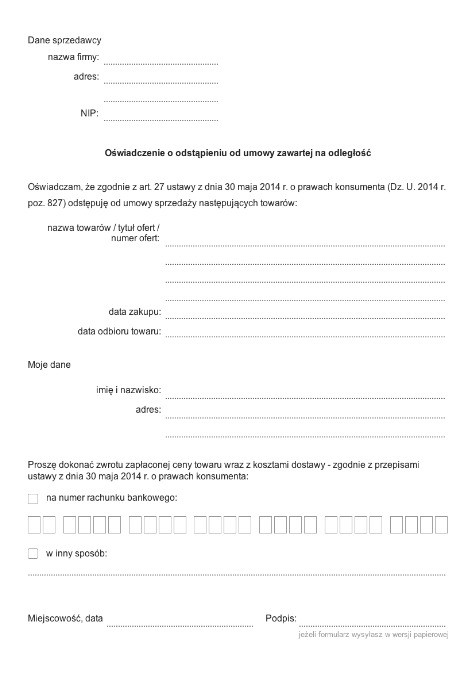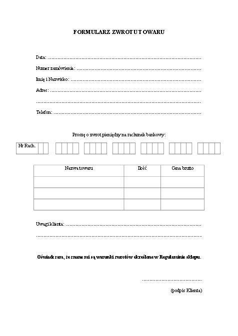 - Formularz odstąpienia od umowy zawarty jest w załączniku numer 2 do Ustawy o Prawach Konsumenta oraz na samym dole niniejszego Regulaminu. Klient może skorzystać ze wzoru formularza, jednak nie jest to obowiązkowe. W przesłanym liście musi znaleźć się data zakupu, nazwa zwracanego produktu, nr zamówienia, dokument sprzedaży (faktura), nr konta bankowego do zwrotu pieniędzy i dane kontaktowe Klienta.